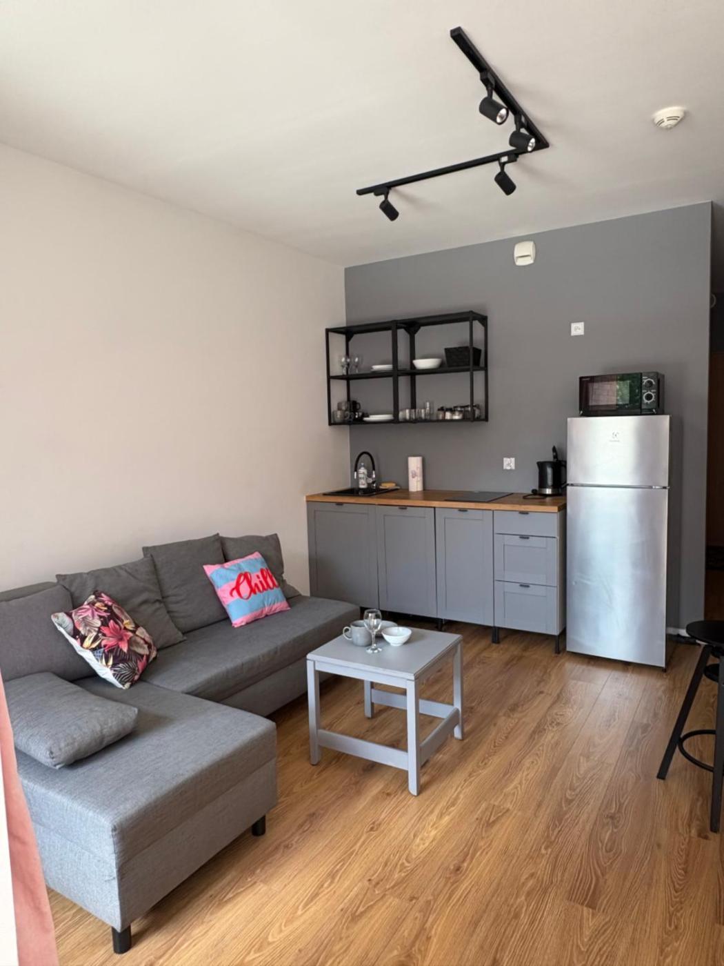 Studio z rozkładaną sofą. Meals can be prepared in the well-fitted kitchenette, which has a stovetop, a refrigerator, a dishwasher and kitchenware. The studio features an electric kettle, parquet floors, a balcony with city views as well as a private bathroom boasting a shower. The unit has 1 bed. Studio - 2 osobowy. Powierzchnia pokoju ok.: 28 mkw.